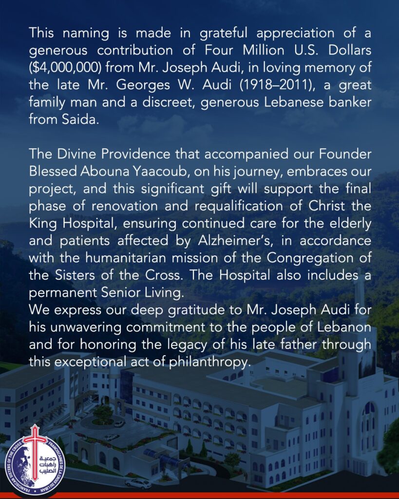 The Divine Providence that accompanied our Founder Blessed Abouna Yaacoub, on his journey, embraces our project, and this significant gift will support the final phase of renovation and requalification of Christ the King Hospital, ensuring continued care for the elderly and patients affected by Alzheimer’s, in accordance with the humanitarian mission of the Congregation of the Sisters of the Cross. The Hospital also includes a permanent Senior Living.